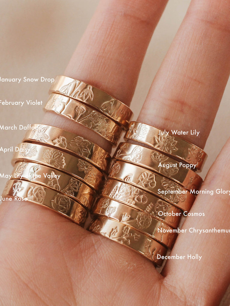 Birth Month Flower Ring, 14K Gold Filled Hand Stamped Band, Gift for Her, Birthday Gift, Floral Jewelry wedding flower